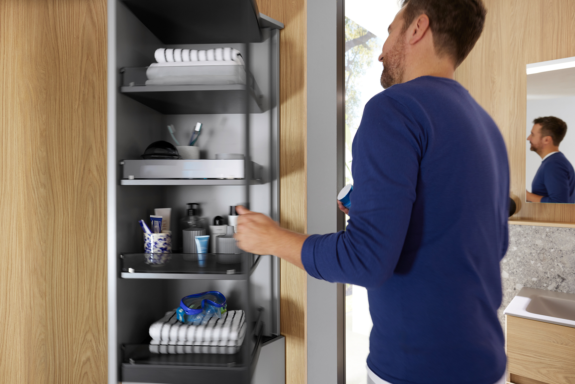 Das Prinzip der neuartigen Öffnungsmechanik ist einfach und verblüffend zugleich: Mit einer spielend leichten Rotationsbewegung dreht sich beim MagicTwist von burgbad ein quadratischer Innenschrank um 180 Grad – mit nur minimalem Ausscheren aus der vertikalen Mittelachse. Das Drehmoment ist so ausbalanciert, dass auch kostbare Inhalte wie etwa Parfum-Flacons nicht ins Rutschen geraten. Ermöglicht wird dies durch einen innovativen Drehbeschlag, der unsichtbar in doppelten Böden versteckt ist. Damit erhalten Badnutzer einen einfachen Zugriff auf die hinten liegenden Bereiche des Schranks – und damit auch auf jene Flaschen, Körbe und Utensilien, die sonst immer im Dunkeln bleiben. Ist der Schrank geöffnet, steht keine Tür im Weg.