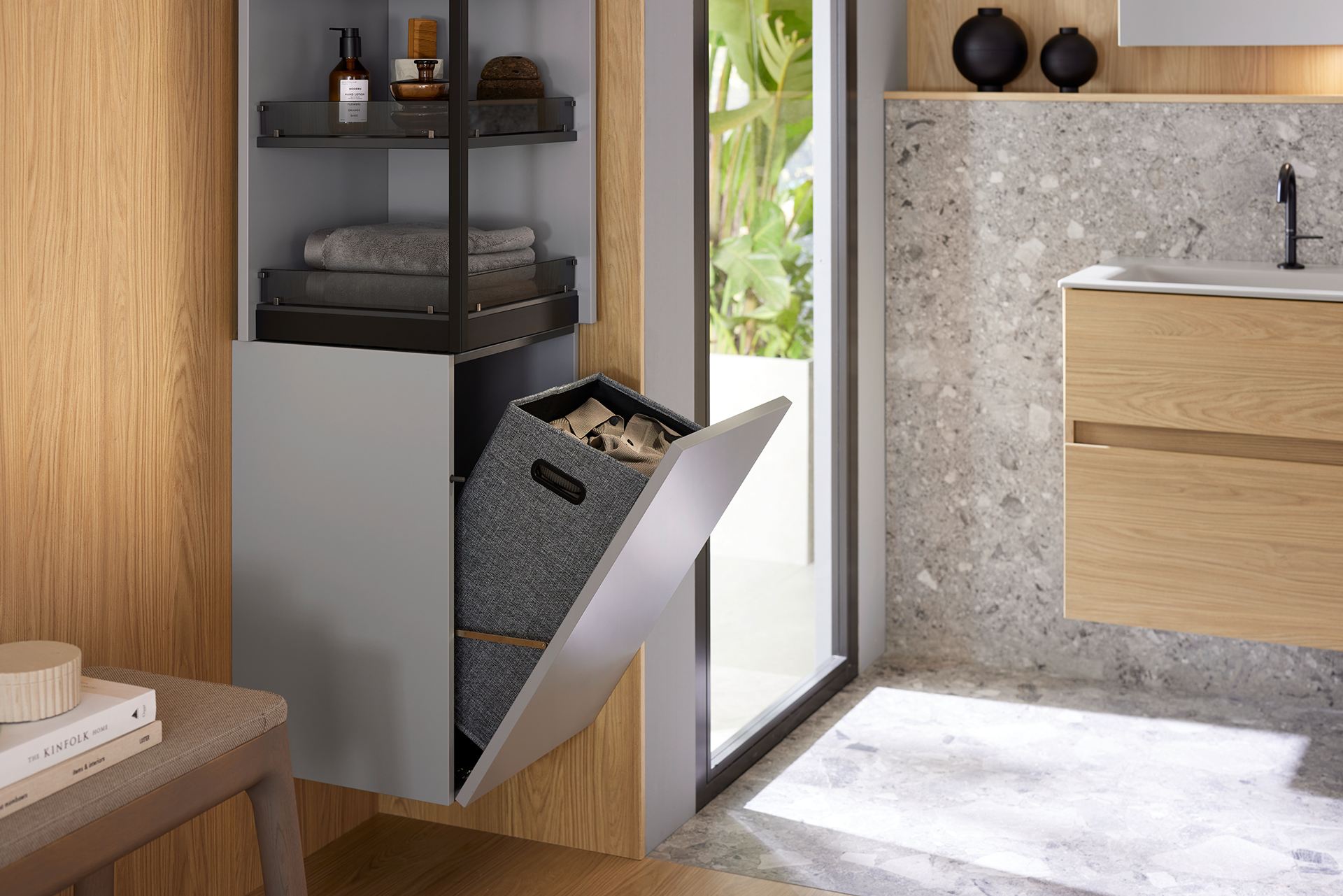 Wie von Zauberhand lässt sich das nach zwei Seiten offene, quadratische Regal um sich selbst drehen und verschließen. Dank eines geschwungenen Führungssystems in dem hier erstmals im Bad verwendeten neuen Drehbeschlag kann der obere Teil des burgbad-Hochschranks MagicTwist sein Inneres um die eigene Achse drehen und komplett nach außen kehren. Badutensilien wie Kosmetika und Bodylotion, Zahnpasta und Haarbürsten, Aftershave und Parfüm verschwinden hinter schlichten Fronten und erscheinen bei Bedarf wieder griffbereit und komfortabel in Augenhöhe. Im unteren Teil des Schranks ist eine praktische Wäschekippe mit Stoffkorb integriert.